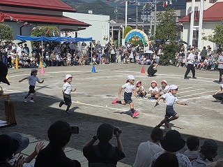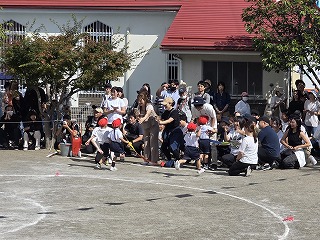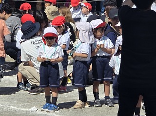 同じチームの友だちとバトンをつなぎ、走り終わても友だちを一生懸命応援した年長さん。負けてしまっても拍手を送る姿がとても素敵でした。
