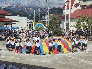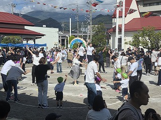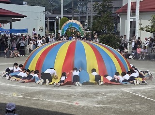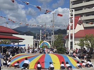 パラバルーンはみんなの心を一つに、一人ひとりが腕をピン!と伸ばしたり、力強くパラバルーンをひっぱって大きな技を成功させました。特に『花火』という技では空高く花火が打ちあがり大歓声が起きていました!