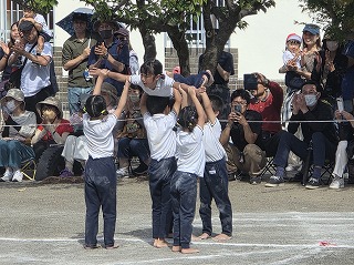 一人技から始まり、二人・三人…九人とどんどん人数が増えていくたびに、技の難易度も上がっていく組体操!