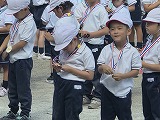 頑張ったお友だち(幼児さん)には閉会式で先生から一人ひとりメダルをもらいました。
