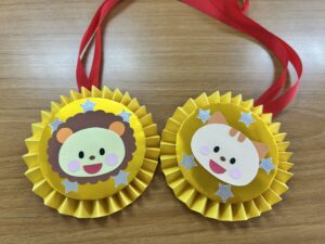 頑張ったお友だち(幼児さん)には閉会式で先生から一人ひとりメダルをもらいました。