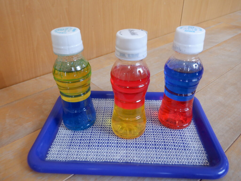 センサリーボトルがここの所人気でベビーオイルと水にそれぞれ食紅で色を付けボトルに入れ振ると……きれいに色が混ざり「うわぁ~♪」「赤~!!」とうれしそうな声が♪しばらく見つめていると分離し色が分かれることが不思議なようで何度も振って楽しんでいましたよ。