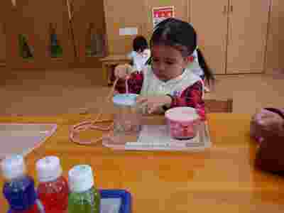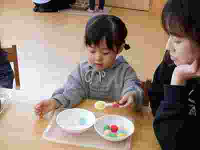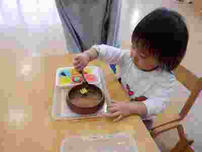 登園後はモンテッソーリの時間です!えんじぇる教室が始まった5月頃は「やってみたい!」「触ってみたい!」と手に取るだけだったお友だちですが、最近では1つのお仕事をやりきることができるようになり、集中力に成長を感じました。