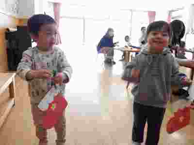 そこで、クリスマスの赤いブーツ作りをしました。えんじぇる教室では初めてくれよんを使い、お家の方と「好きな青だね♪」「上手に描けたね」などとお話しながら満足がいくまでお絵かきをしたり、星を飾ったりして、かわいいブーツが出来上がりましたよ!