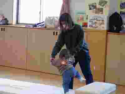 跳び箱ジャンプ!自分の力でよじ登り、大きくジャンプできました♪