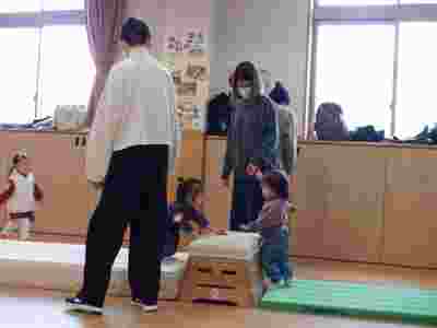 製作の後は、サーキット遊びです!!ホールにいろいろな遊具を用意し、お家の方と順番に巡って体を動かしていきました。