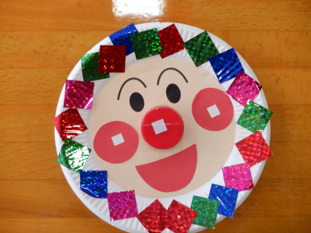 アンパンマンのお顔が出来上がり、次の工程へ。紙皿の周りにお家の方と力を合わせてきらきらテープを貼り付け完成です★