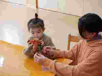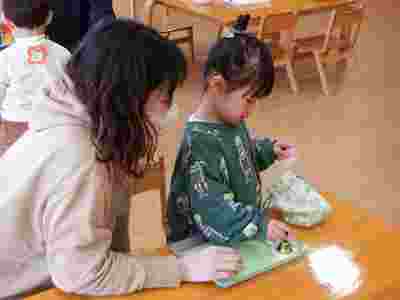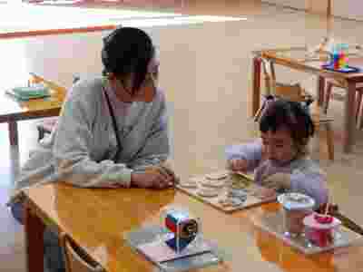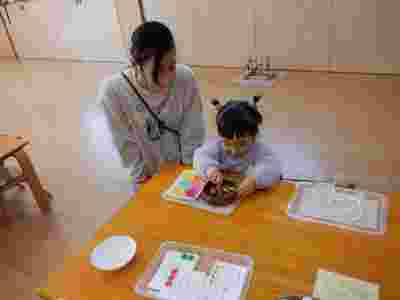 5月からはじまったえんじぇる教室。1日の流れがしっかりと分かり、幼稚園に来てくれたお友だちから用意をし、お仕事に取り組むことができました。シール貼りも枠の中に貼ろうと集中して付けたり、ピンクタワーを横や縦に並べ楽しんだり、ひみつ袋から物を取り出しお家の方と眺めたりと…興味のあるお仕事は何度も集中して取り組む姿も見られましたよ。