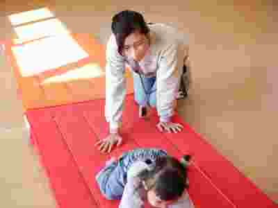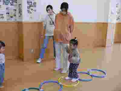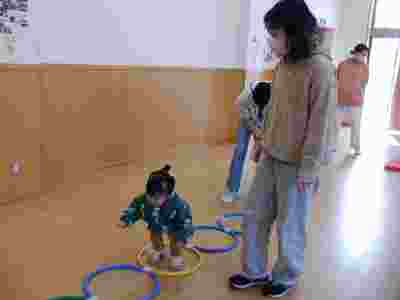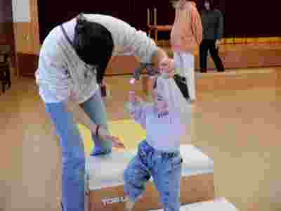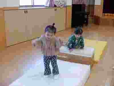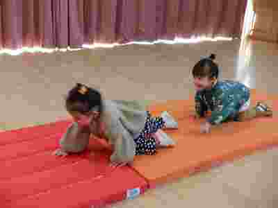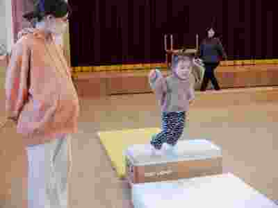 製作の後はサーキット遊びをしました。前回、幼稚園の体操教室でお世話になっている清水先生に教えていただいたマットや跳び箱を使いサーキット遊びをしました。お家の方と手を繋いで平均台を歩いたり、慣れてくると…お家の方からの「頑張って!!」の掛け声で自ら平均台や跳び箱をよじ登りジャンプする姿も見られ、身体の使い方も上手になったなぁと関心しました。