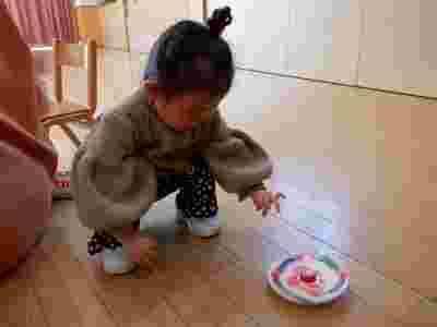 思い思いのアンパンマンのこまが出来上がると「くるくる~♪」とお友だちとつぶやきながら楽しんで回す姿が見られました。